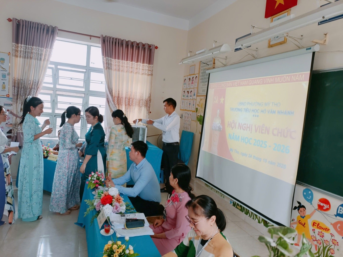 Hội nghị cán bộ, công chức, viên chức Trường Tiểu học Hồ Văn Nhánh năm học 2025–2026 đã diễn ra thành công tốt đẹp. Tập thể sư phạm nhà trường quyết tâm phát huy những thành tích đạt được, vượt qua khó khăn, thi đua dạy tốt – học tốt, góp phần thực hiện thắng lợi nhiệm vụ năm học mới.